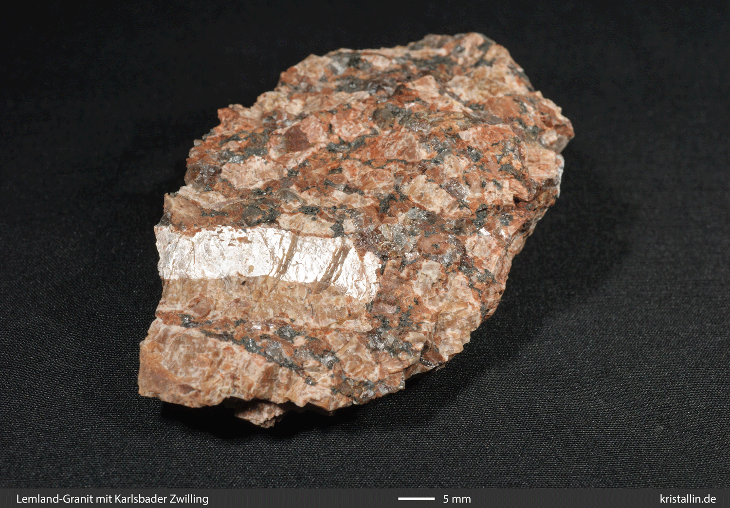- Der Alkalifeldspat ist oft perthitisch entmischt und sieht dann fleckig aus. Viele der länglichen Feldspäte sind Karlsbader Zwillinge.