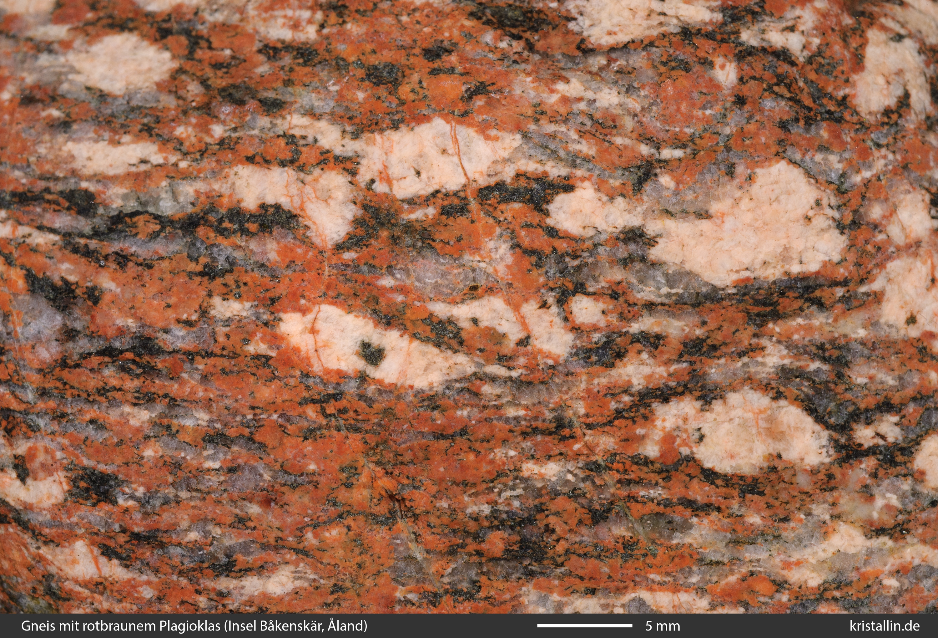 - Der zweite Feldspat ist braunroter oder brauner Plagioklas, dessen Kristalle dunkler und kleiner sind als die Alkalifeldspäte. Die für Plagioklas typischen Zwillinge sind nur selten erkennbar.