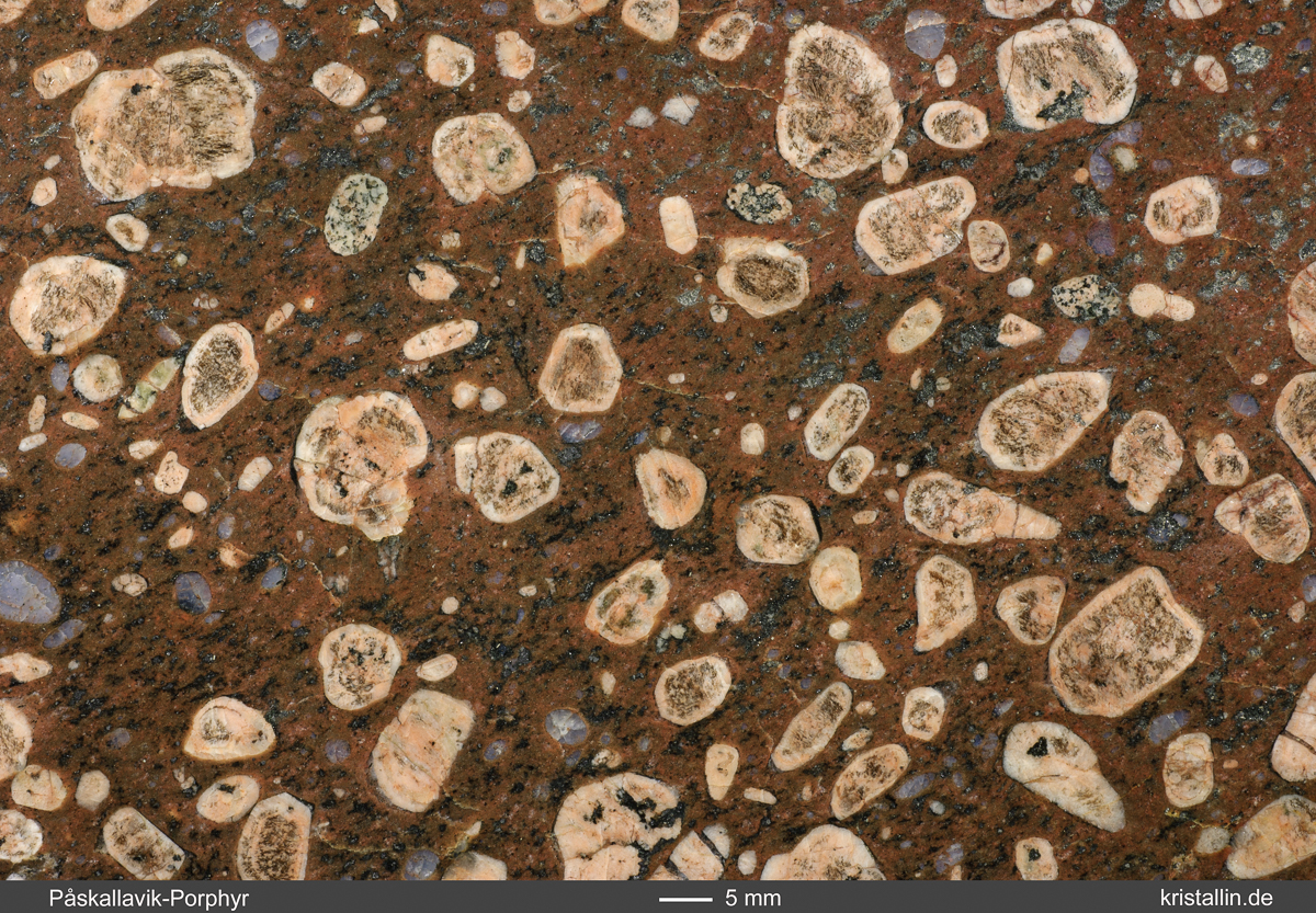 Påskallavik-Porphyre zeigen unterschiedliche Gefüge. In der Geschiebekunde werden aber nur die Varianten als Påskallavik-Porphyr bezeichnet, die viele gerundete Feldspäte von etwa 0,5 bis 1 cm Durchmesser enthalten und in einer braunen bis dunkelbraunen, feinkörnigen Grundmasse stecken. Die rundlichen Einsprenglinge bestehen aus Alkalifeldspat, der meist hell fleischfarben bis beige gefärbt ist. Oft enthält er kleine Flecken von dunklen Mineralen. Hin und wieder sind die Feldspateinsprenglinge außen von einem dünnen hellen Saum umgeben. Manche der Kristalle sind zerbrochen.