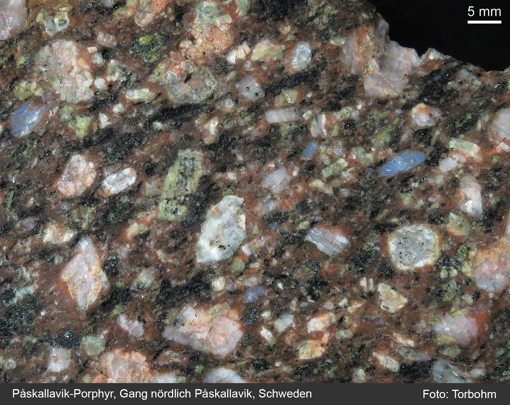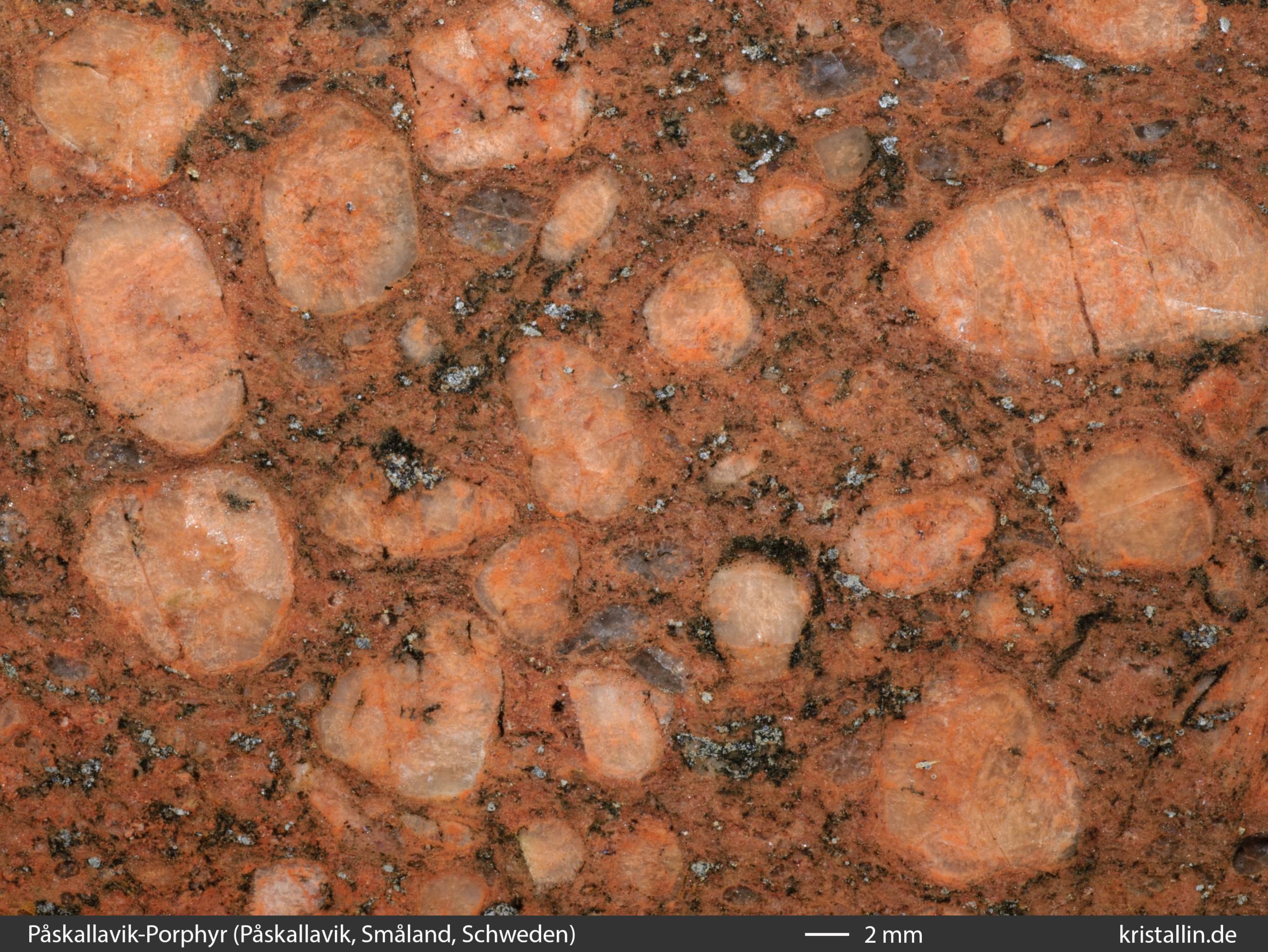 Gelegentlich zeigen Påskallavik-Porphyre eine insgesamt rötliche Färbung, welche dann Grundmasse und Einsprenglinge gleichermaßen umfasst.
