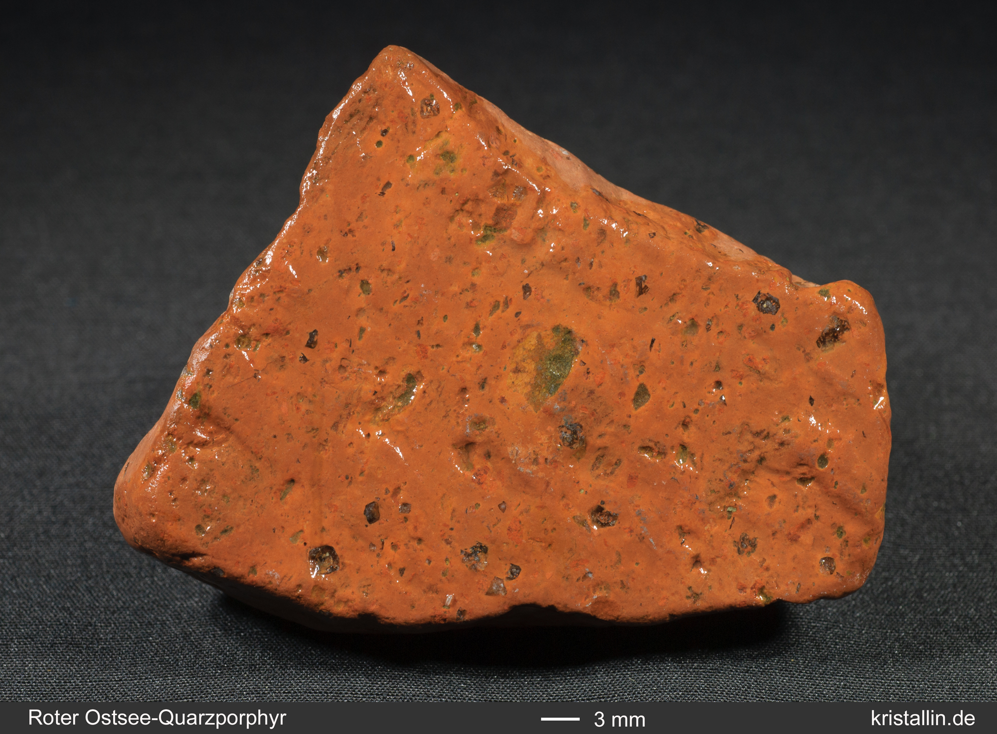 Der Rote Ostsee-Quarzporphyr fällt bereits durch seine intensive, meist ziegelrote Farbe auf. Ohne Lupe wirkt das Gestein homogen und Details sind kaum erkennbar, wenn man von den fast immer enthaltenen dunklen und feinkörnigen Xenolithen absieht. Sie gehören zu den charakteristischen Merkmalen dieses Porphyrs und sind zwischen wenigen Millimetern und etlichen Zentimetern groß. Diese unregelmäßig geformten Einschlüsse werden als basaltische Bruchstücke interpretiert, die von der aufsteigenden Schmelze mitgerissen wurden.