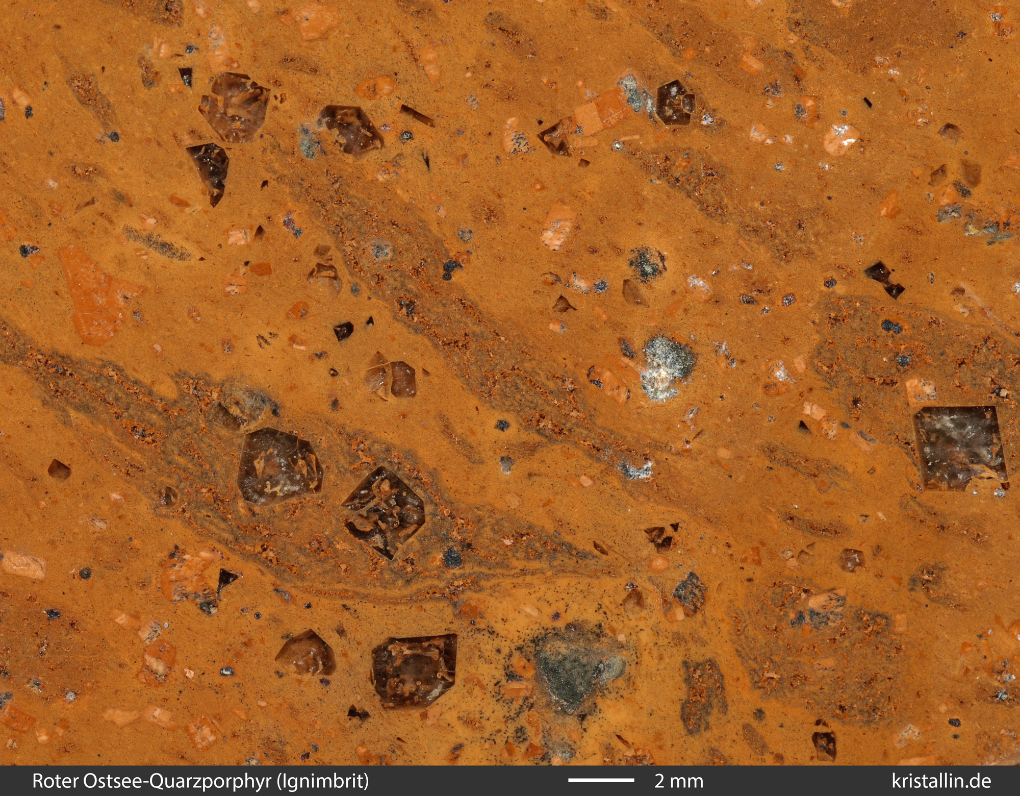 Manche der Roten Ostsee-Quarzporphyre sind Ignimbrite mit hellbraunen Fiamme. Diese „Schlieren“ werden als ehemals weiche Lavafetzen interpretiert, die in den pyroklastischen Strömen explosiver Vulkanausbrüche abgelagert wurden. Die Fiamme sind immer kurz, unregelmäßig geformt bzw. gewellt und schmiegen sich an Kristalle oder Xenolithe an. Nur wenn so ein eutaxitisches Gefüge gut entwickelt ist, kann man von einem Ignimbrit reden. Schlieren in der Grundmasse allein genügen nicht. Das folgende Bild zeigt ein Beispiel.